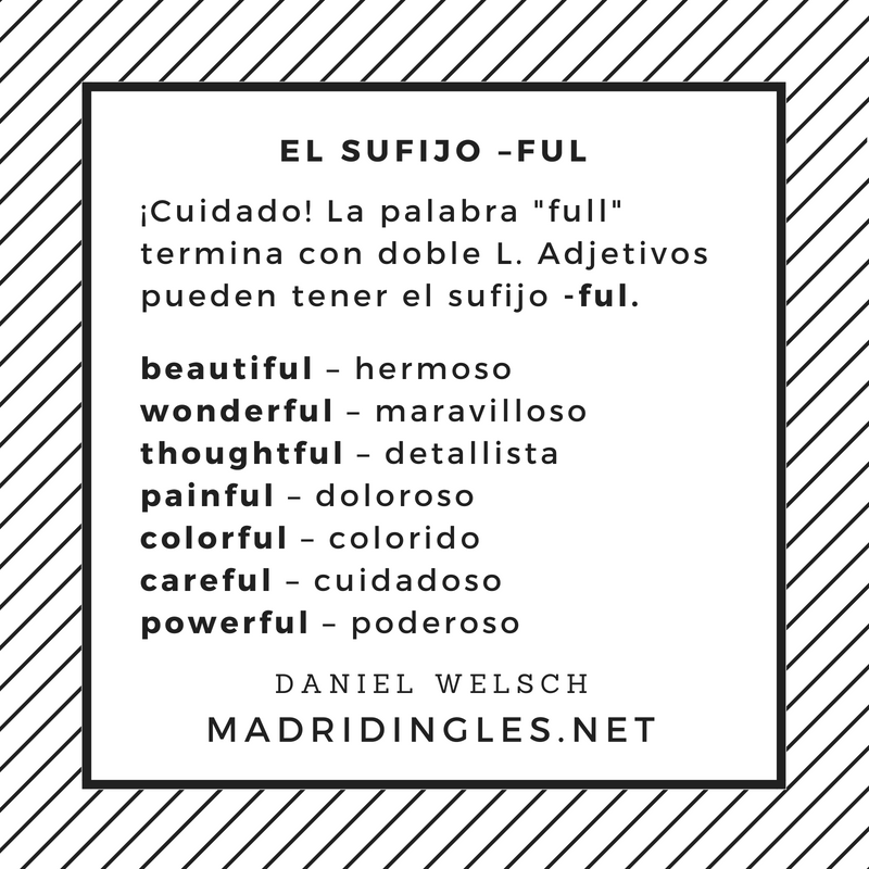 Mi intención aquí no es de hacer una lista completa, pero de dar la idea de que cuando ves una palabra nueva con -ful o -less, normalmente puedes adivinar el significado sin muchos problemas.